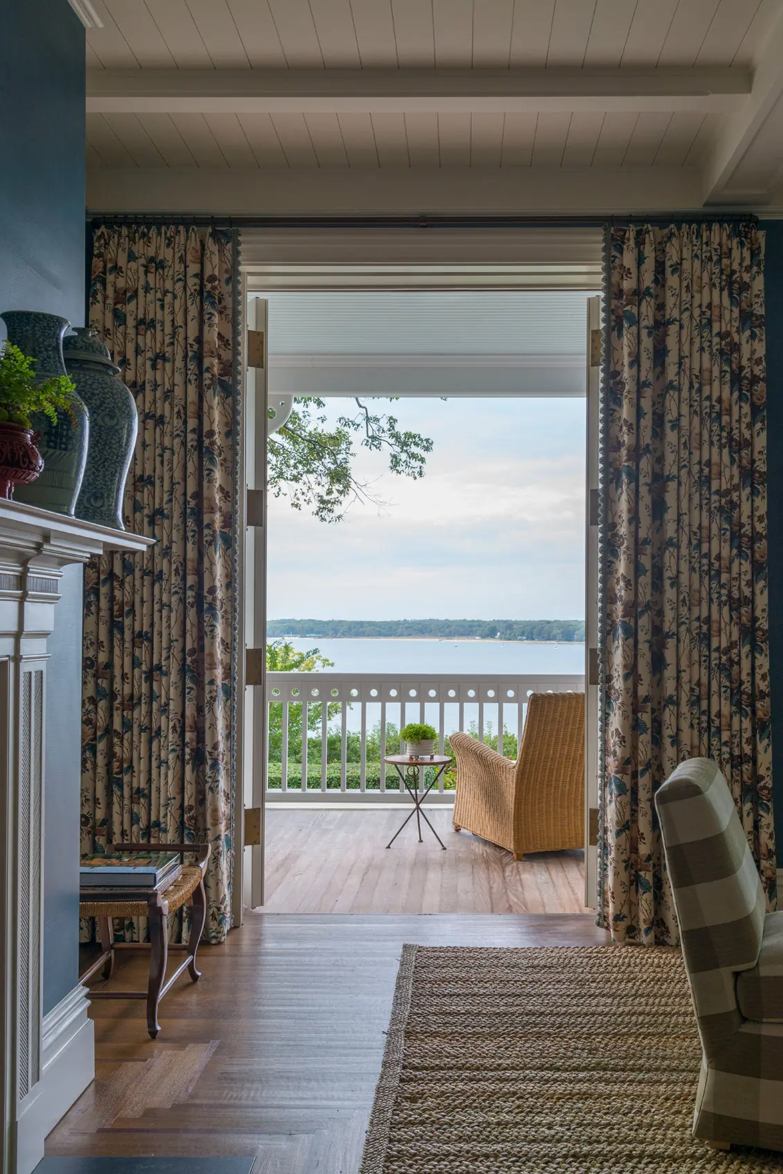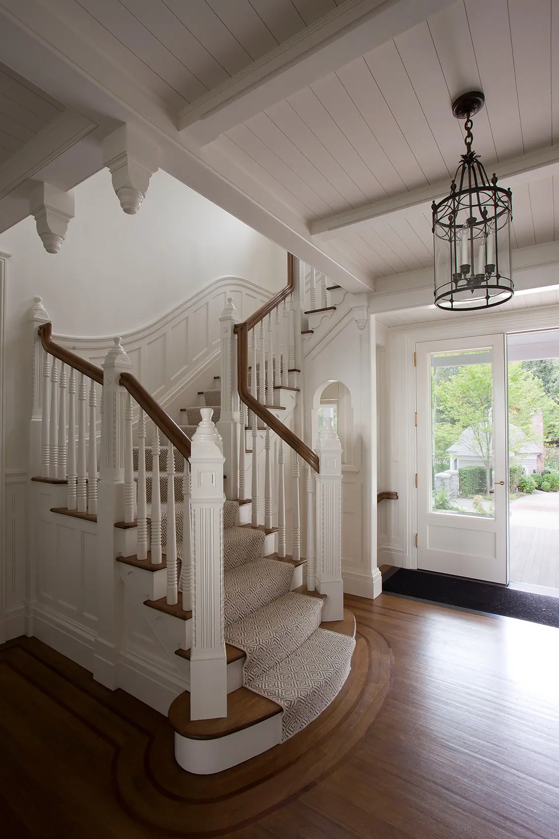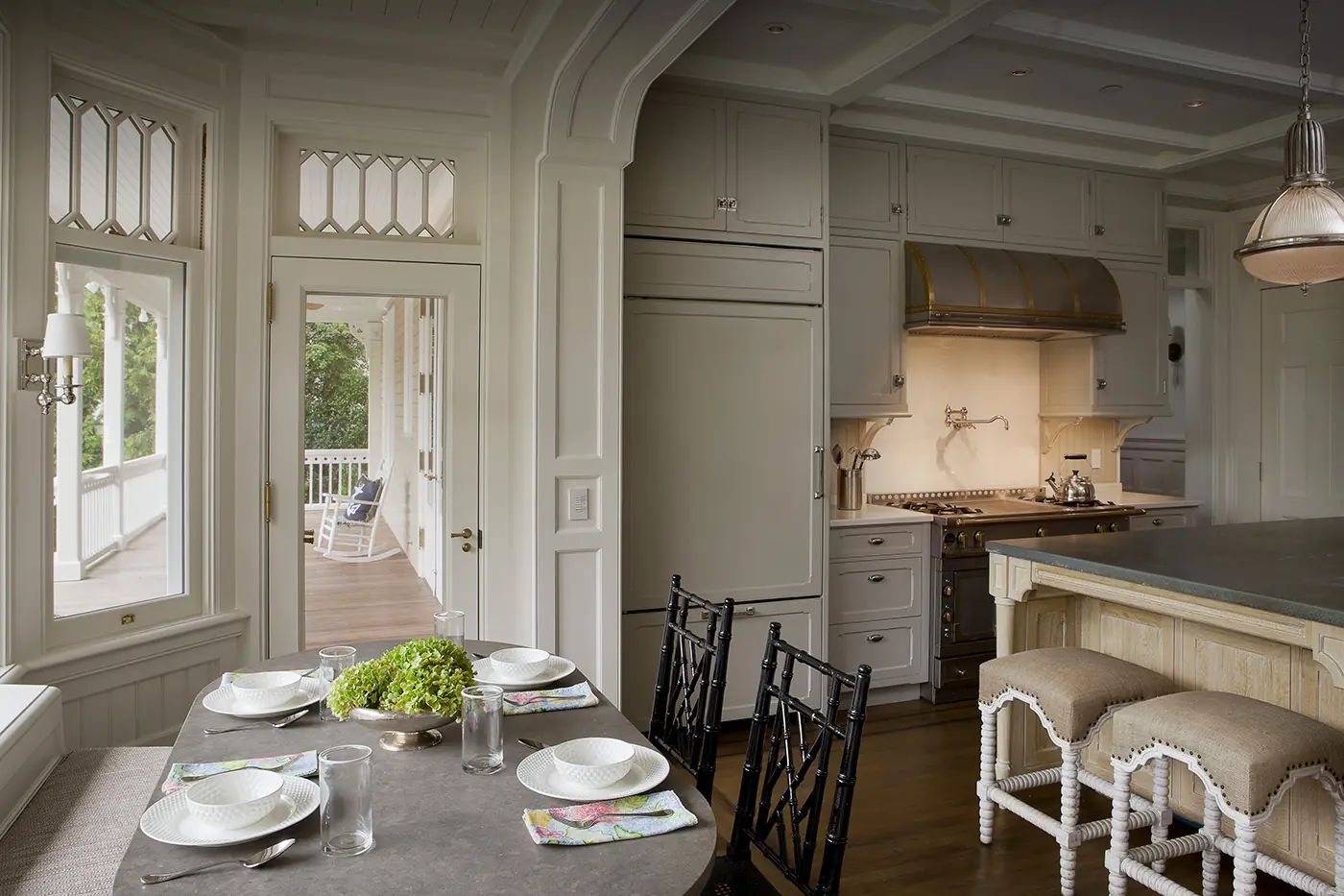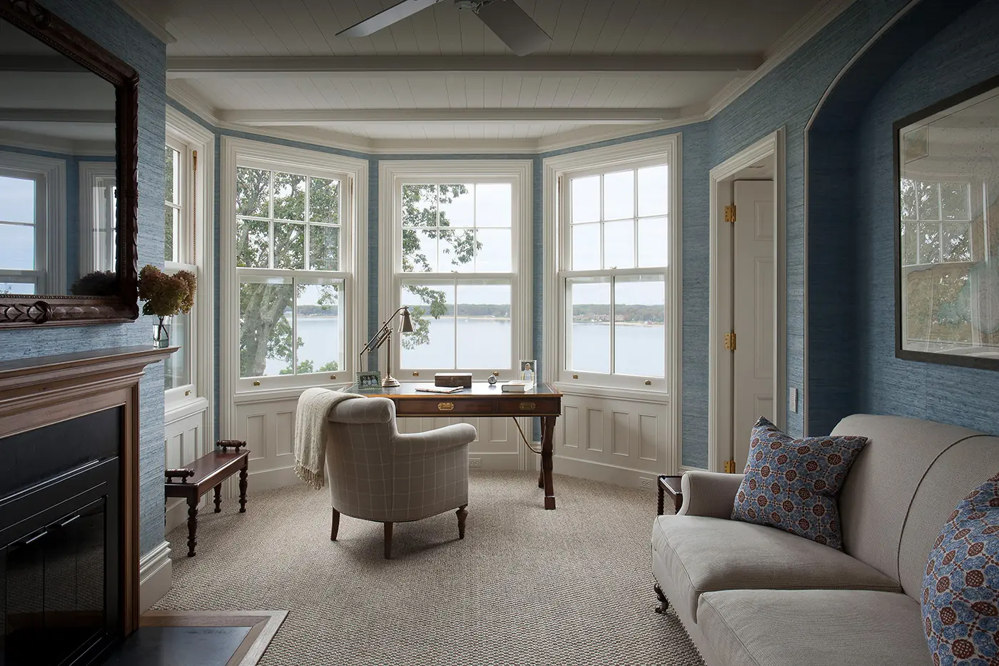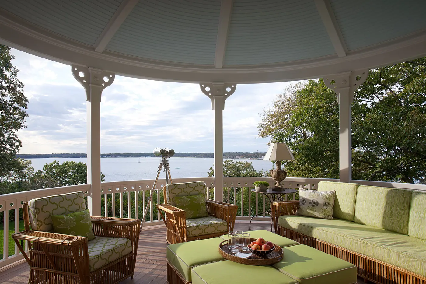 The house is constructed with wood framing, clad in clapboard siding, and adorned with stone veneer. In the renovation process, the foundation of the existing house was completely replaced, and temporary shoring frames were employed to elevate and support the existing structure. Notably, the house underwent a reorientation during the renovation, with the formal entry now positioned to face the vehicular approach and pool. The turreted porch has been extended to encircle the house, offering panoramic views of the bay.