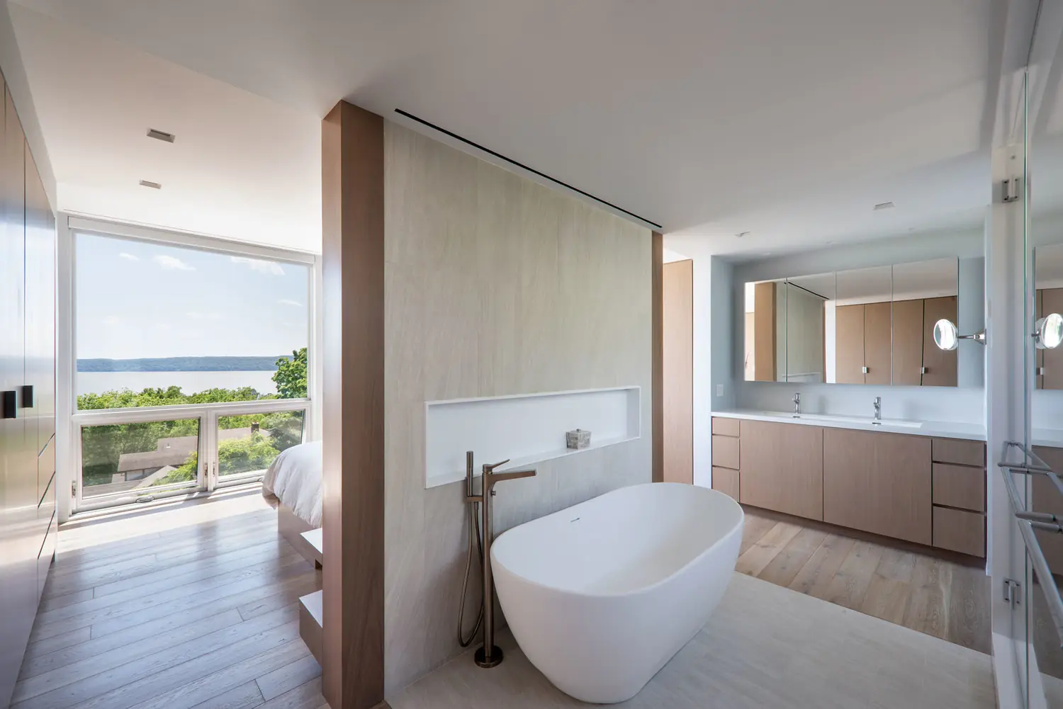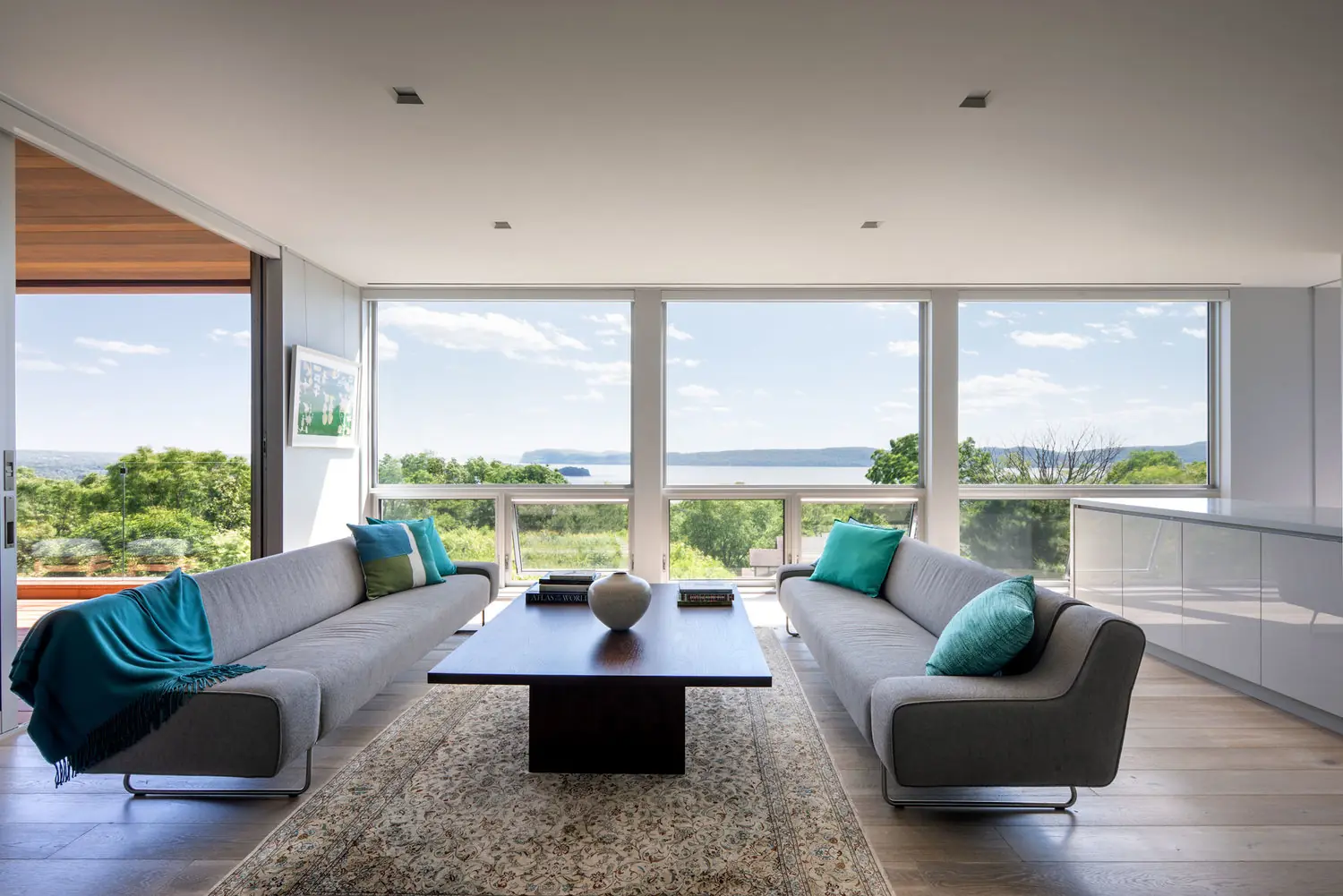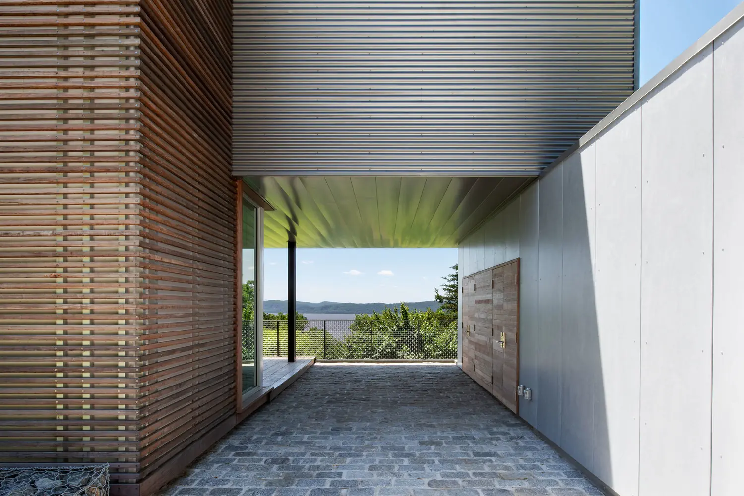 Perched above a steep slope with a commanding view of the Hudson River, the 2,210-square-foot lap pool features a concrete shell seamlessly integrated with the stepped foundation. This foundation not only anchors the building to the steep incline but also contributes significantly to the lateral stability of the entire structure.